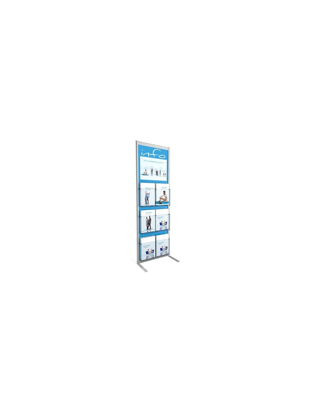 Infodisplay. Ideale per avvisi e comunicazioni, struttura in alluminio, piedi in metallo verniciato a polveri epossidiche, pannello in polistirene, vaschette in PETG: 1 scomparto in formato A3 con profondità 0,4 cm, 6 scomparti A4 con profondità 4,5 cm. Dimensioni esterne: (LxPxH) 54x45x159 cm.
