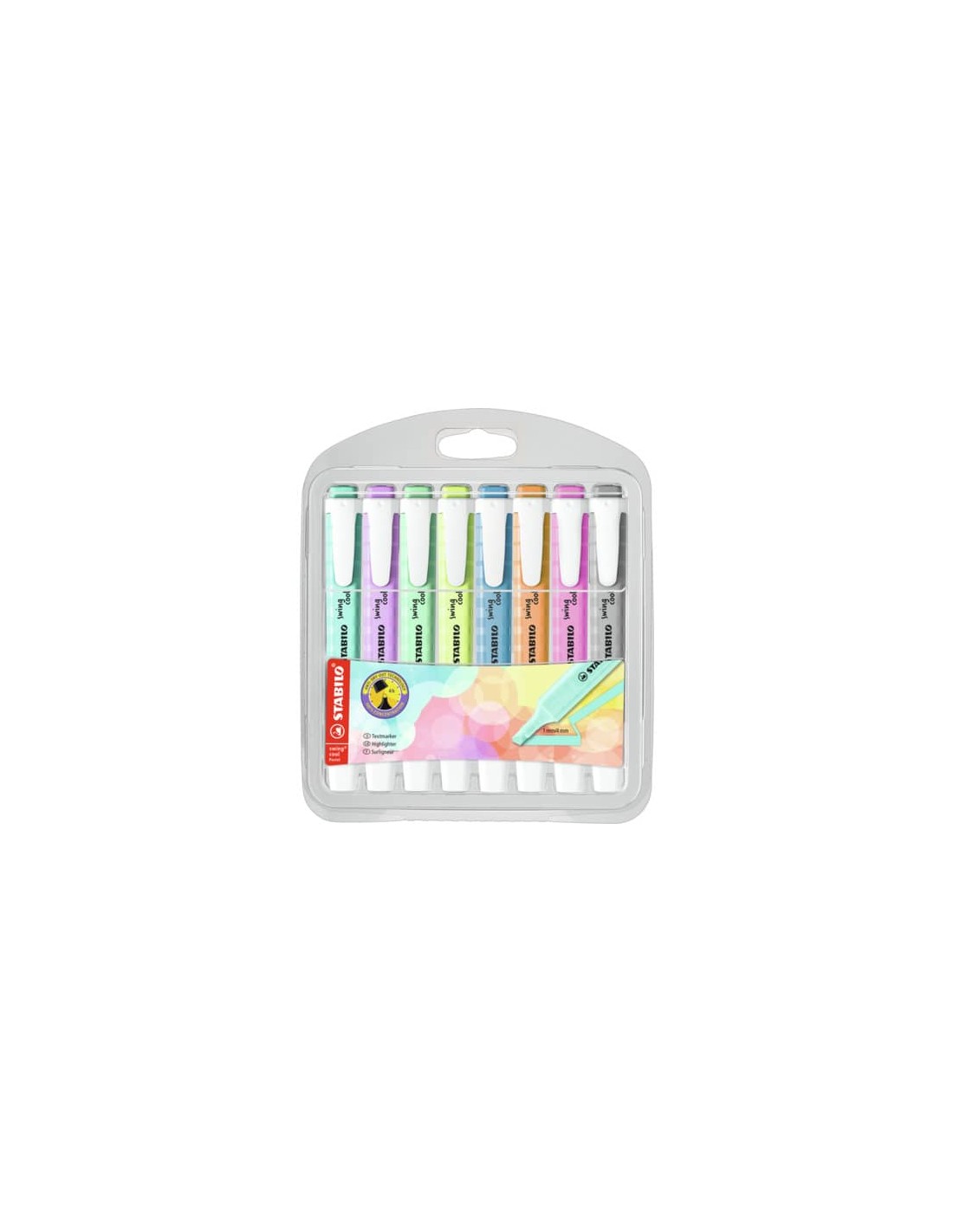 Evidenziatore a tampone con comoda clip ideale per ragazzi e studenti. Con la tecnologia Stabilo Anti-Dry-Out resiste fino a 4 ore senza cappuccio. Doppia ampiezza tratto 1+4 mm. Confezione composta da 8 colori assortiti.
