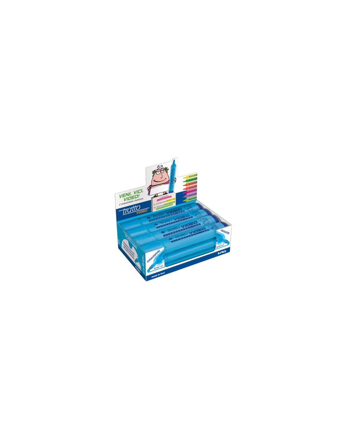 Evidenziatore Tratto Video. Evidenziatore punta scalpello" Made in Italy" con inchiostro universale a base acqua. Inchiostro ad elevata fluorescenza che asciuga rapidamente. Storico prodotto della linea Tratto, adatto sia per un uso scolastico che professionale. Ideale per carta normale, autoricalcante, da fotocopie e fax. Colore: azzurro.