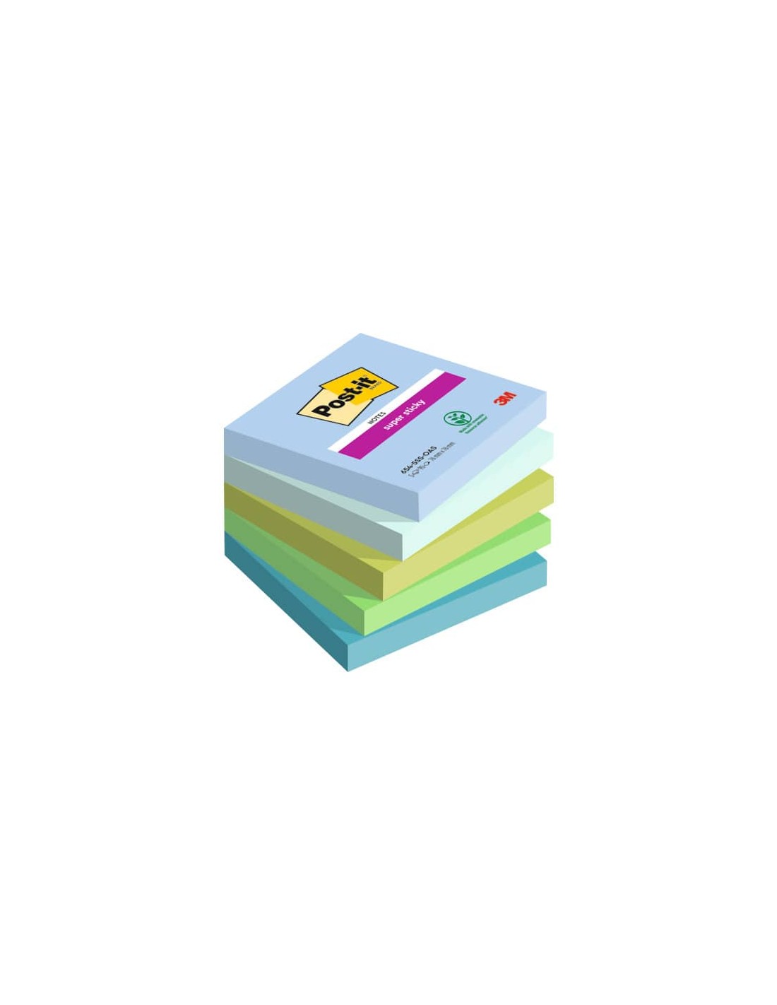 Blocchetti da 90 foglietti Post-it® Super Sticky con adesivo rinforzato che si attacca praticamente su tutte le superfici senza lasciare traccia. Assortimento a tema Oasis: blu jeans, verde menta fresca, verde lime, verde trifoglio e verde cristallo di mare. Formato 76x76 mm, contenuto 5 blocchetti da 90 foglietti cadauno.