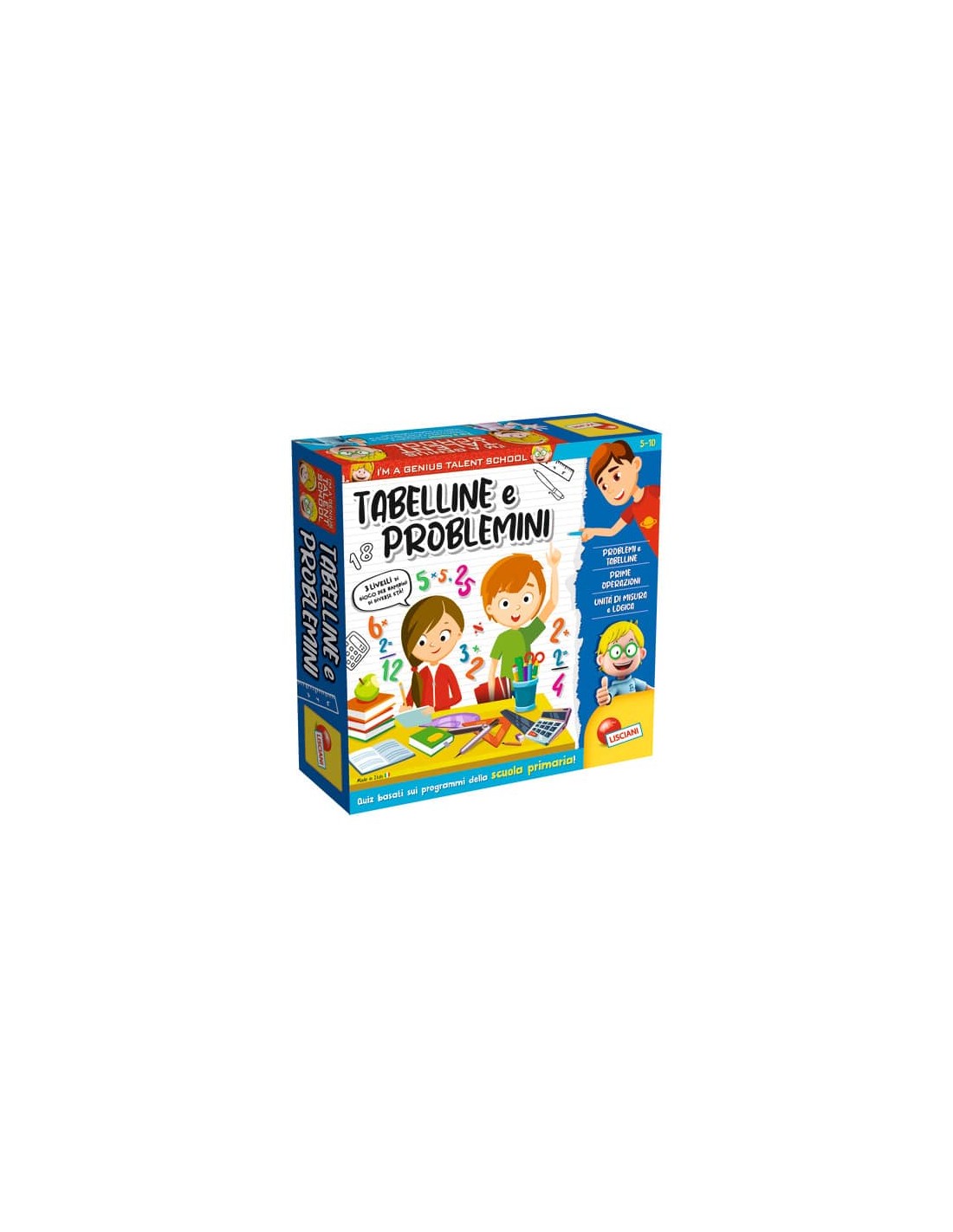 L’aritmetica non è mai stata così divertente! Un gioco di percorso a quiz, basato sui programmi della scuola primaria, per imparare l’aritmetica. Grazie ai tre livelli di difficoltà, possono giocare insieme bambini di età diversa. Risolvi i divertenti problemini, supera le prove con le tabelline, avanza sul tabellone e conquista le coccardine! Contenuti e dettagli: gioco educativo in scatola - 1 plancia di gioco - 1 spinner - 16 gettoni tondi - 12 coccarde - 27 carte speciali - 4 birilotti.