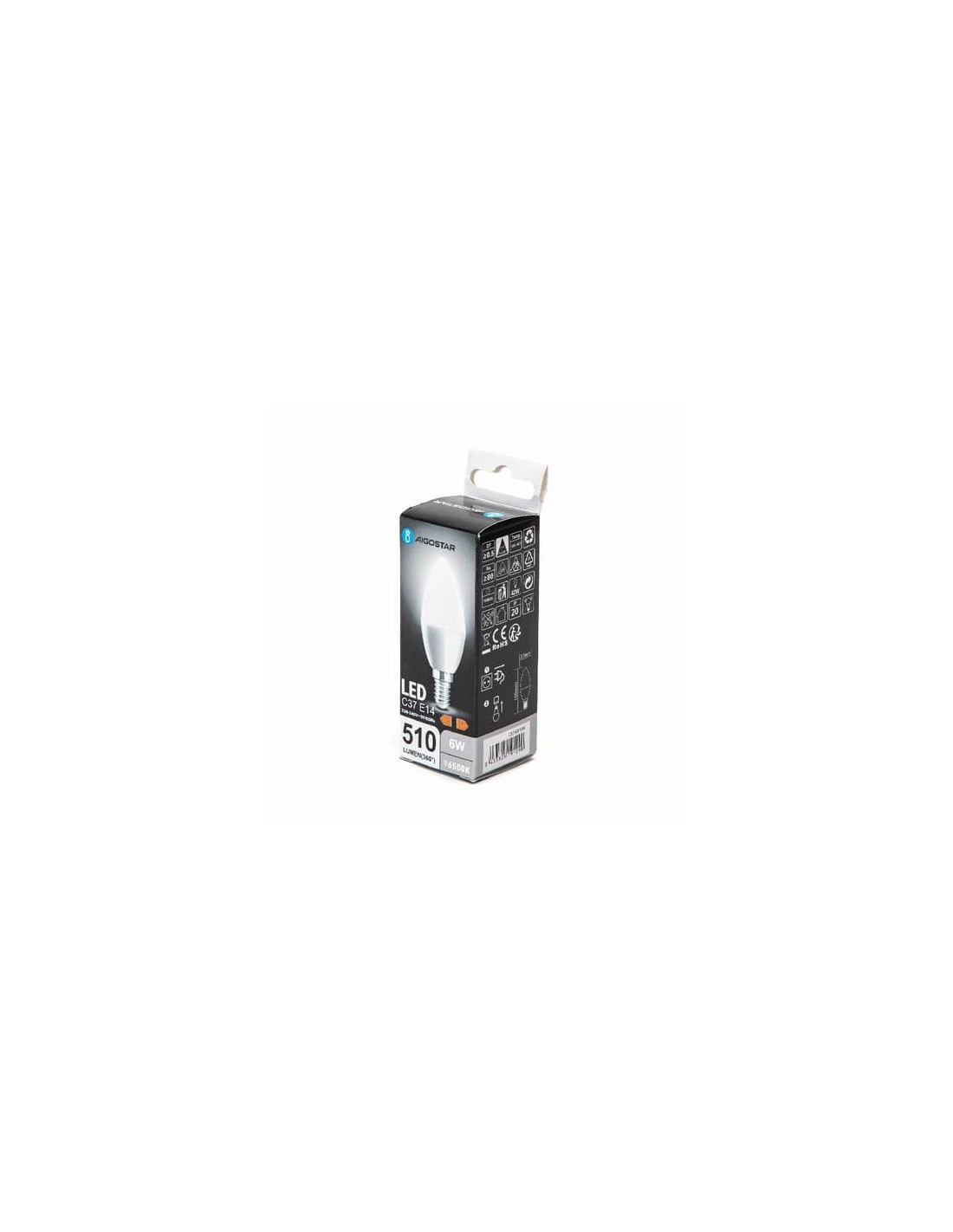 Lampadina LED C37 E14 6W. Vita utile 15.000 ore. Può essere ampiamente usato in varie scene casa o in ufficio, ecc. Facile da installare. Potenza 6W. Temperatura di colore 6500K. Flusso luminoso 510 lumen. Voltaggio 220-240V~. DF ≥0,5. Intensità corrente 40mA. Frequenza 50/60Hz. Angolo di illuminazione 220°. Adattatori per lampadine E14. Luce fredda. Utilizzo in ambienti interni. Certificazione CE.