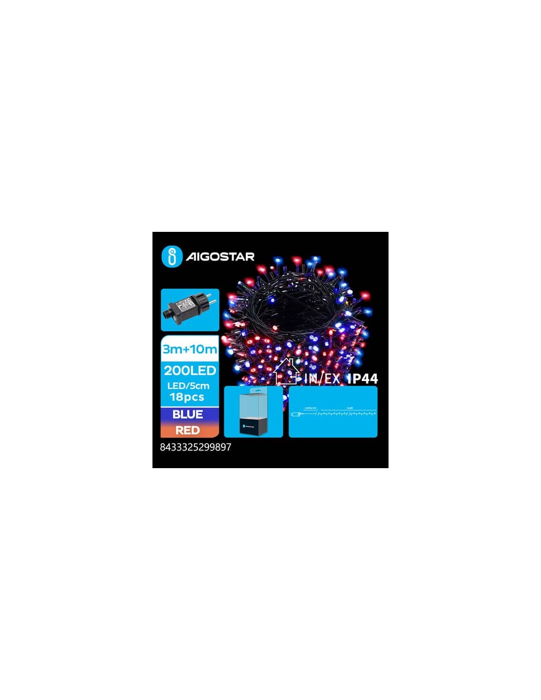Catena luminosa a basso voltaggio 200 led. Utilizzo ideale come luci di Natale, luci per decorare giardini, feste, aree campeggio...non c'è limite agli utilizzi delle catene luminose. Lunghezza: 3m+10m. Utilizzo IN+OUT. 5cm/LED. N°8 modalità di illuminazione + memoria + timer. Luce rossa e blu. Lampadine a testa piatta. Potenza: 3,6W. DC: 31V. IP44.
