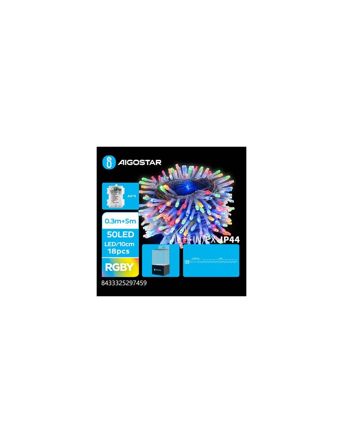 Catena luminosa a batteria con lampadine a testa piatta. 50 Led. Utilizzo ideale come luci di Natale, luci per decorare giardini, feste, aree campeggio...non c'è limite agli utilizzi delle catene luminose. Multicolore: luce rossa, verde, blu e gialla. Lunghezza: 0,3m+5m. Utilizzo IN+OUT. 10cm/LED. N°8 modalità di illuminazione + memoria + timer. DC: 4,5V. IP44. Capacità batteria: 80mA. Funziona con 3 batterie AA.