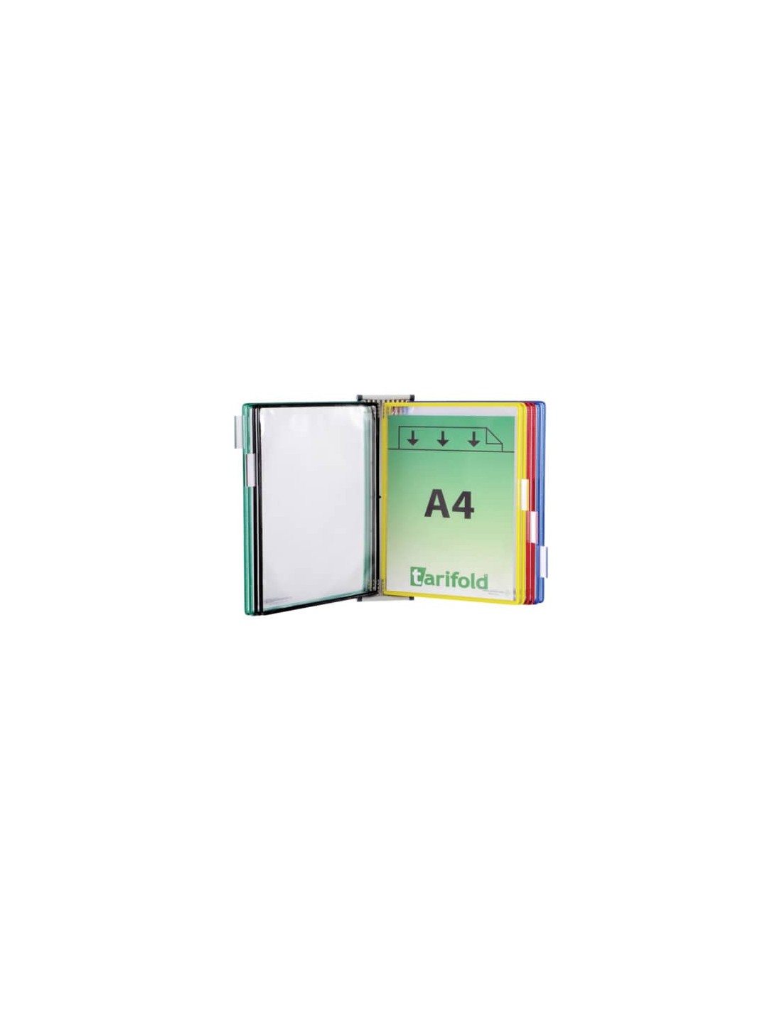 Base in metallo con 10 buste in PVC con apertura superiore e bordo rinforzato con anima in acciaio e 5 cavalierini da 50 mm. Angoli in plastica che permettono di inclinare il leggio per facilitare la lettura - Ampliabile all’infinito. Base magnetica per semplice affissione e spostamento da superfici metalliche.