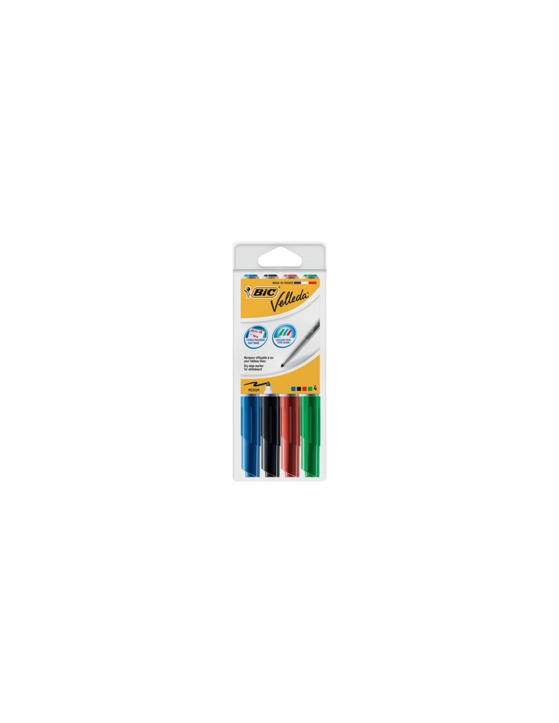 Marcatore Velleda con inchiostro a base di chetone, senza xilene ne toulene. Fusto in plastica facile da impugnare. Punta tonda ultra resistente da 1,4 mm. Cappuccio del colore dell'inchiostro con blocco di sicurezza. Astuccio in cartoncino da 4 (blu, verde, rosso e nero).