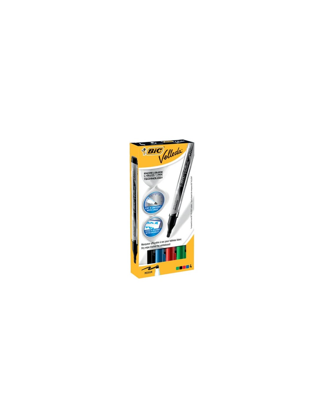 Pensati per chi vuole realizzare presentazioni vivaci e di grande impatto, BIC ha sviluppato i pennarelli BIC Velleda Liquid Ink con un inchiostro liquido che è ancora più radioso. L’inchiostro liquido è progettato per offrire una scrittura fluida e dura più a lungo. L’inchiostro a base di alcol è praticamente inodore. Inoltre, offre una migliore cancellabilità sulle lavagne anche dopo diversi giorni. Astuccio da 4