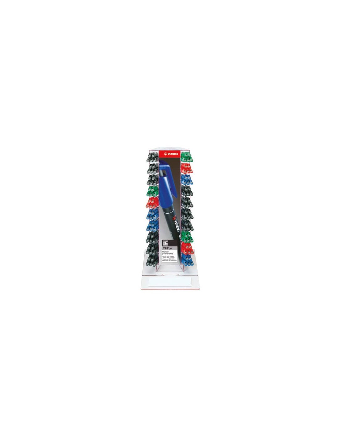 Penna OHPen ideale per lucidi e per quasi tutte le superfici lisce (cd-rom, DVD, plastica, vetro, metallo e ceramica). Impugnatura zigrinata, fondello e cappuccio ventilato con clip nel colore dell'inchiostro. Punta superfine, ampiezza di tratto 0,4 mm. Espositore composto da 150 marcatori, colori assortiti.