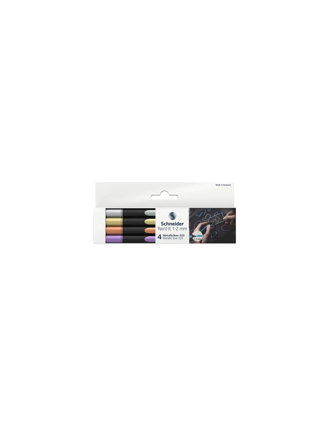 Pennarello per lavori fai da te con fusto realizzato per l’88% in bio plastica. Inchiostro metallizzato di alta qualità, ideale per calligrafia, decorazioni e molto altro, come ralizzazione di biglietti d'invito e augurali. Risultati impressionanti anche su altre superfici lisce e non assorbenti. Asciugatura rapida e pressoché inodore. Spessore tratto 1-2 mm. Astuccio composto da 4 pezzi, colore oro, argento, rame e viola.