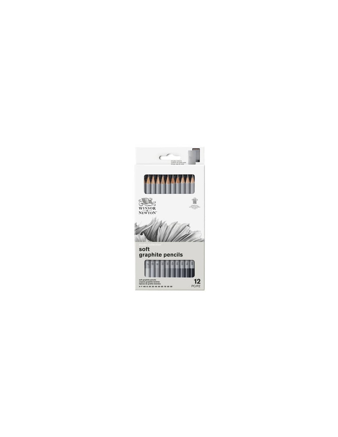 Scatola in metallo composta da dodici matite in grafite tenere Winsor&Newton. Mina di alta qualità centrata ed incollata su tutta la lunghezza: estremamente resistente alla rottura. Diversi gradi di durezza: H 2.0mm, HB 2.1mm, F 2.0mm, B 2.2mm, 2B/3B/4B 2.6mm, 5B/6B 3.1mm, 7B/8B/9B 3.5mm. Fusto rotondo in legno di cedro con anima infrangibile che si affila in modo pulito.