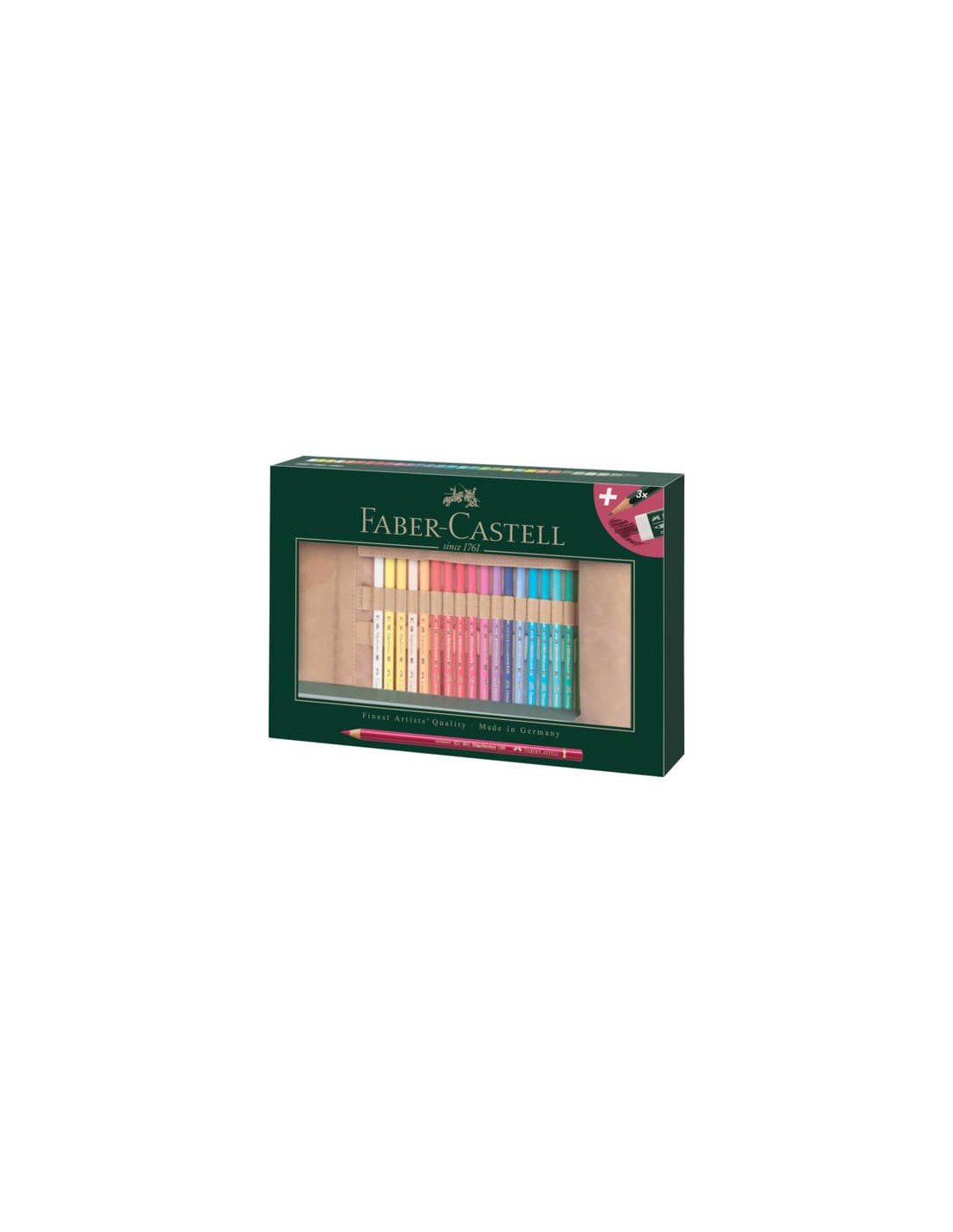 Matite Colorate per artisti Polychromos permanenti di alta qualità. Pigmenti pregiati e brillanti, eccellente stabilità alla luce. Tratto morbido e intenso. Mine pastose a base di cera e resistenti all'acqua, non sbavano. Resistente alla rottura grazie al sistema brevettato SV. Fusto in legno di cedro rotondo, Mina extra grossa 3.8 mm a base di olio e priva di acidi. Vernice ecologica a base d'acqua. Rotolo composto da 30 matite colorate, 3 matite Castell 9000 tratto HB, 2B e 8B e 1 gomma in vinile.