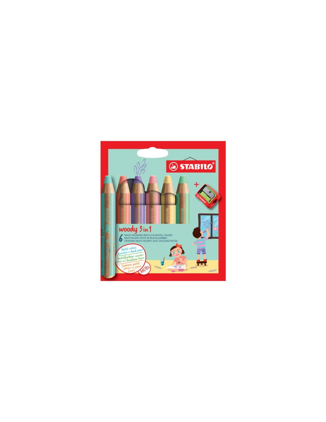 Matita colorata, pastello a cera, acquarello: il pastellone tuttofare. Stabilo woody 3 in 1 può scrivere su innumerevoli superfici come legno, vetro, plastica, cartone e lavagne, grazie alla sua mina morbidissima e ricca di colore. Può essere rimosso facilmente da tutte le superfici lisce e porose (finestre e lavagne bianche e nere): basta un panno umido. Stabilo woody 3 in 1 è fatto da legno 100% certificato PEFC, proveniente da foreste sostenibili. Non sbava è inodore ed offre prestazioni di lunga durata. In poche parola è lo strumento ecologico ed ideale per contrassegnare e scrivere su differenti superfici. Prodotto in conformità con il regolamento REACH (CE) n. 1907/2006. I pastelli Stabilo woody 3 in 1 sono l'ideale per bambini e genitori - sono lavabili dal vetro e possono essere utilizzati su molteplici superfici, non solo carta o cartone. Il matitone colorato Stabilo woody 3 in 1 è disponibile in 18 colori, ma funge anche da pastello a cera ed acquarello. Grazie al colore intenso ed opaco, può essere utilizzato anche per colorare su fogli scuri. Stabilo woody 3 in 1 è talmente versatile che viene utilizzato anche dagli artisti più esperti. Elevata opacità e intensità di colore anche su fogli scuri e sul vetro. Punta XXL - contiene una quantità di colore equivalente a quella di 8 matite colorate standard. Perfetto per colorare ampi spazi e adatta per qualsiasi tecnica di pittura. Fusto grosso ideale per le mani dei bambini: ideale per la presa corretta della matita. Mina antirottura, diametro di 10 mm. Tratto grosso e morbido. Confezione composta da 6 pezzi colori pastello.