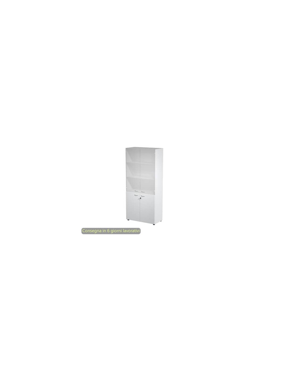 Realizzato in robusto melaminico bilaminato antigraffio ed antiriflesso, con ante basse battenti in melaminico spessore 18 mm, con serratura. Ante medie superiori in vetro temperato satinato di 5 mm di spessore, senza serratura. Struttura di spessore 18 mm. Maniglie in ABS antiurto finitura alluminio. Dotato di 4 solidi ripiani ad alto spessore (25 mm), 3 riposizionabili ed 1 fisso (il secondo dal basso). Profondità utile dei ripiani 42,5 cm. Rifinito posteriormente, con spessore del dietro rigido di 10 mm, può essere utilizzato come parete divisoria. Dotato di piedini regolabili in altezza per un perfetto livellamento col pavimento.