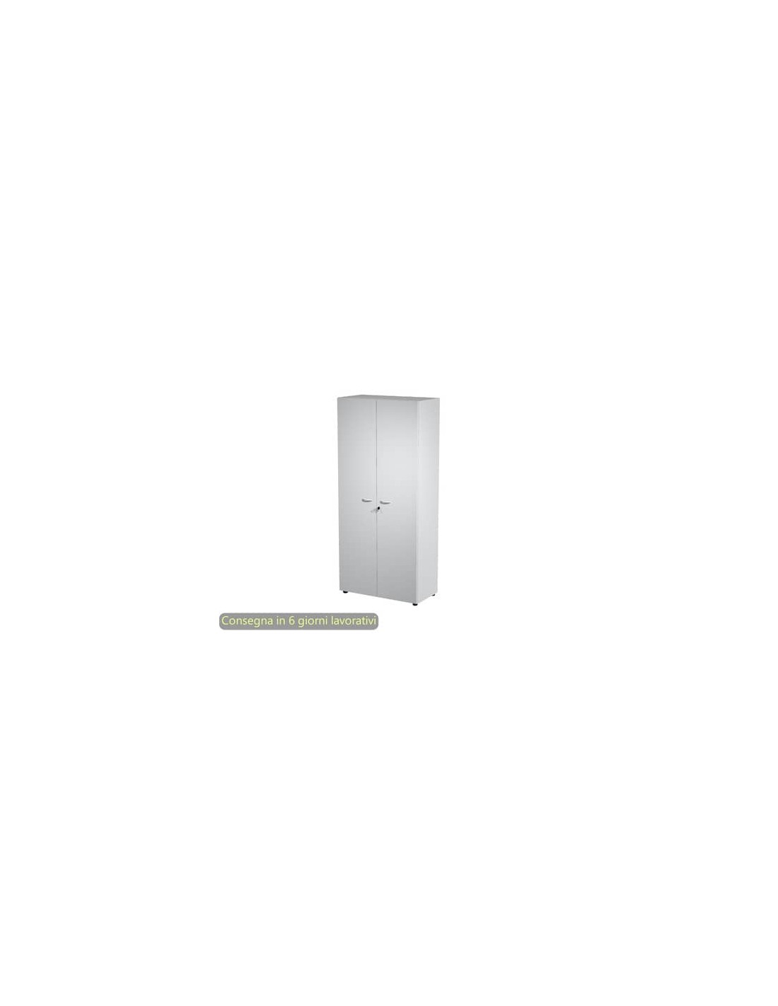 Realizzato in robusto melaminico bilaminato antigraffio ed antiriflesso, con ante alte battenti in melaminico spessore 18 mm, con serratura. Struttura di spessore 18 mm. Maniglie in ABS antiurto finitura alluminio. Dotato di 4 solidi ripiani ad alto spessore (25 mm), 3 riposizionabili ed 1 fisso (il secondo dal basso). Profondità utile dei ripiani 42,5 cm. Rifinito posteriormente, con spessore del dietro rigido di 10 mm, può essere utilizzato come parete divisoria. Dotato di piedini regolabili in altezza per un perfetto livellamento col pavimento.