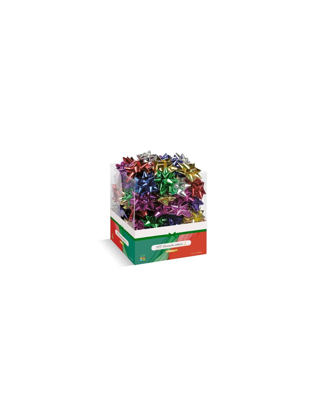 Coccarde adesive in nastro liscio e lucido colorato. Colori assortiti. Diametro 7,5 cm.
