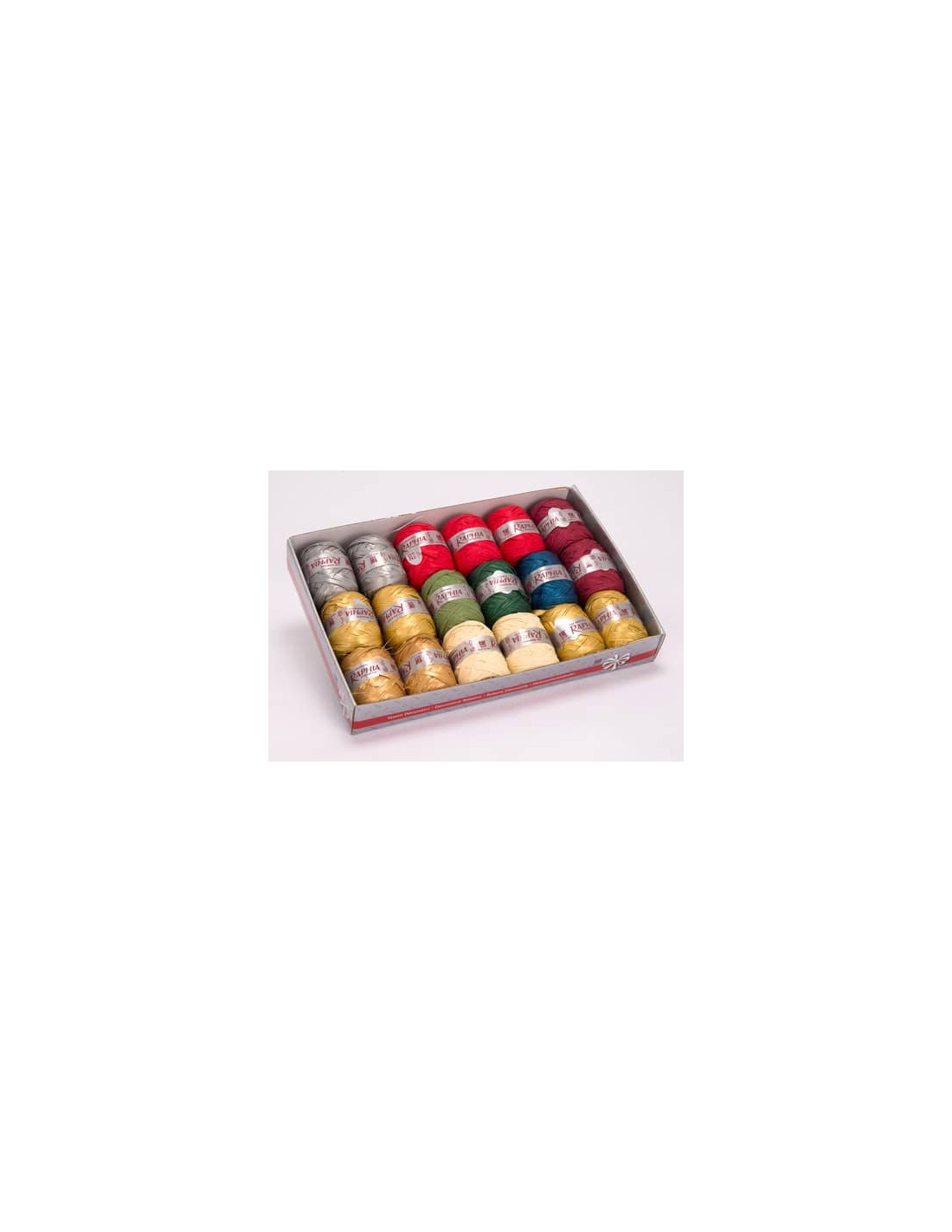 Confezione composta da 18 bobine da 20 metri di raphia synthetic in assortimento Natalizio. Assortimento colori: rosso, arancio, verde scuro, avorio, giallo scuro, oro e argento.