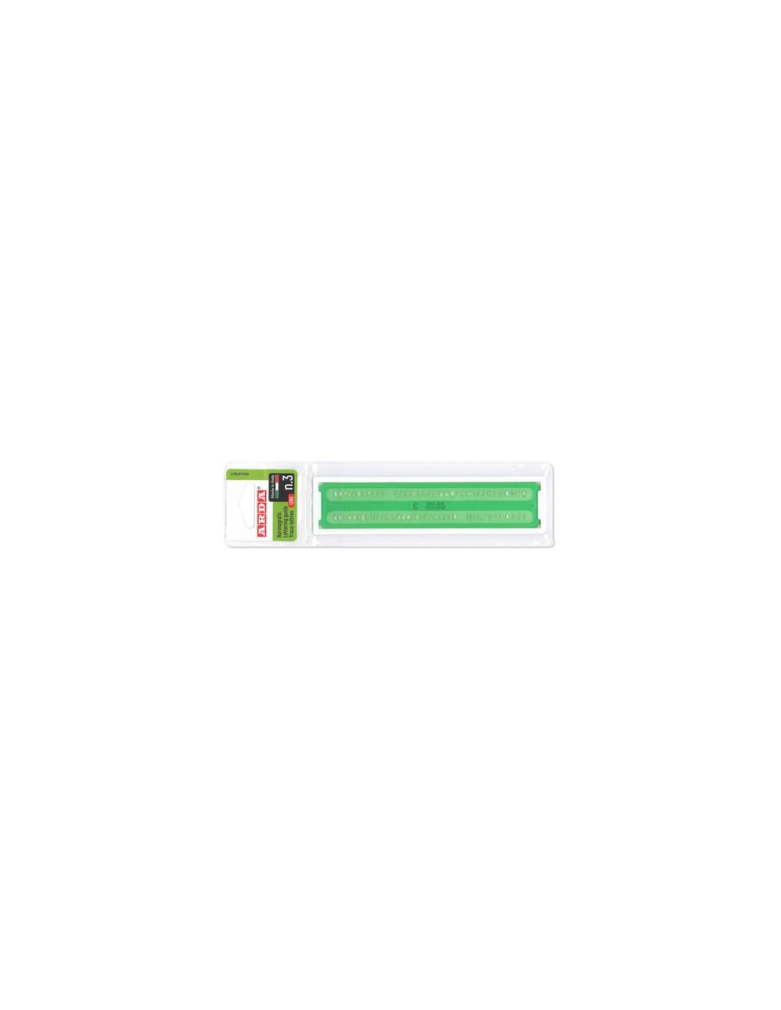 Normografo N° 3, con lettere, numeri e simboli conformi alle norme UNI. L'altezza del carattere è di 3 mm. Il materiale, flessibile e di elevata resistenza, è adatto per scrivere con matita o penna a china. Colore verde.