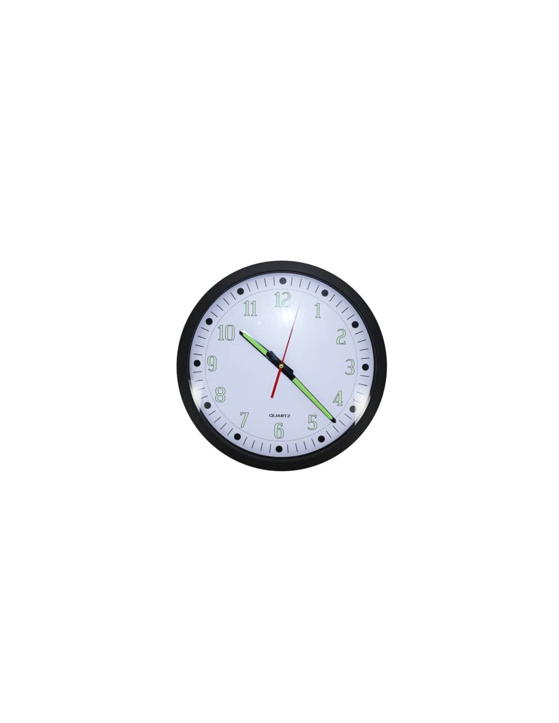 Orologio da parete in plastica dotato di bordo cromato e fondo bianco. Numeri arabi fosforescenti per la lettura facilitata notturna. Diamtero: 34,4 cm.