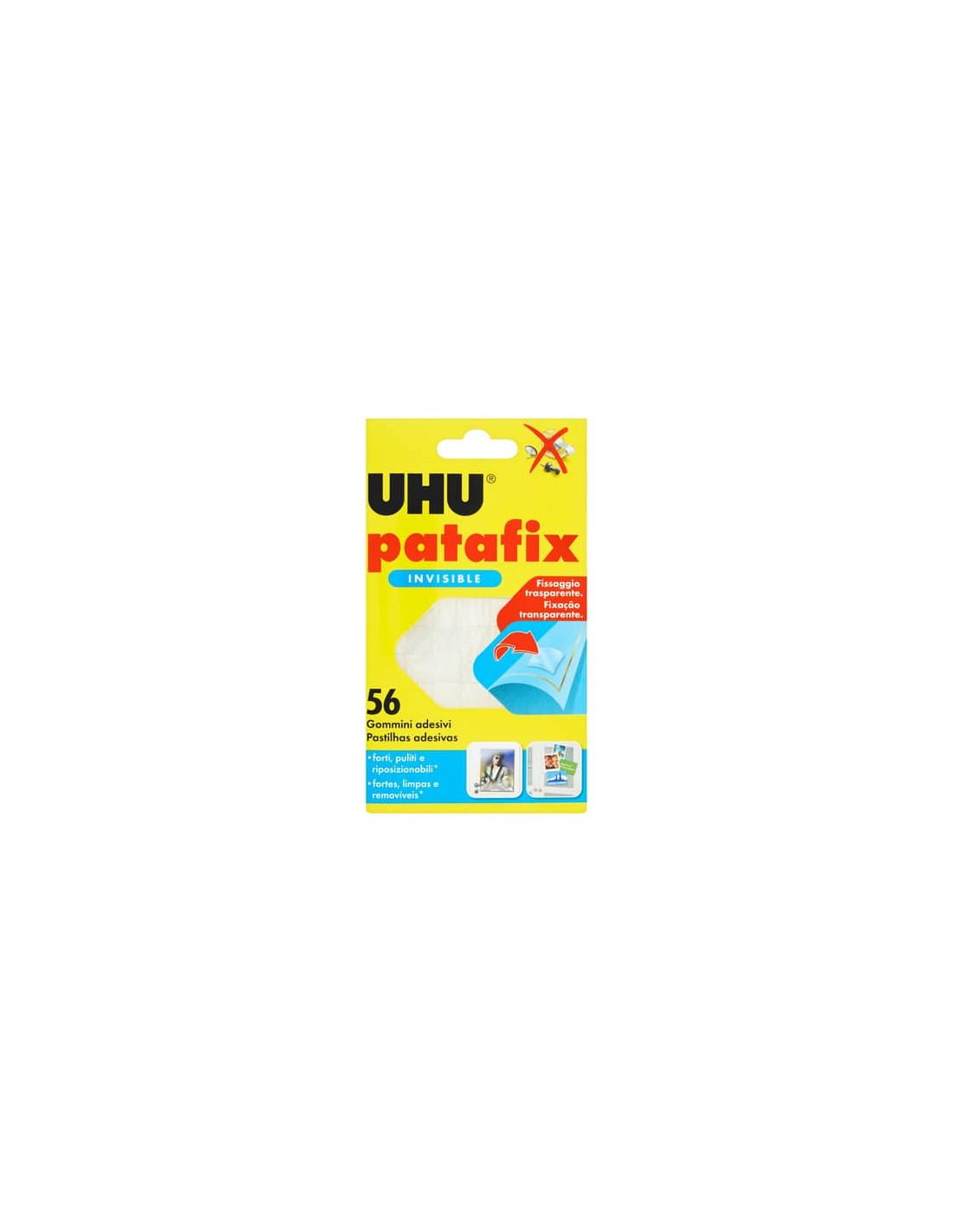 Gommina adesiva trasparente removibile e riutilizzabile per fissare in modo invisibile senza bisogno di colla, puntine e nastro adesivo. Ideale per studi grafici e di architettura, per fissare velocemente lucidi poster, foto, cartoline, memo, decorazioni e piccoli oggetti su muri, porte, specchi, ante e ripiani. Adatta per legno, vetro, metallo, plastica, ceramica e per la maggior parte dei materiali. Le gommine fissatutto invisibili Patafix sono utili in mille occasioni a casa, a scuola, in ufficio. Colore: trasparente. Contenuto: 56 gommini.