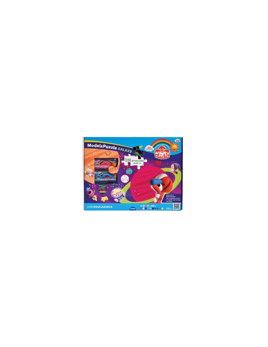 Un nuovo soggetto spaziale per la linea Didò Model&Puzzle amata dai bambini da giocare giorno e notte. Con 500 g di pasta per giocare Didò, le formine alta definizione, gli accessori e il maxi puzzle spaziale che si illumina al buio. Contenuto: 1 x Maxi puzzle glow in the dark; 10 x salsicciotti 50 g; 6 x formine alta definizione; 1 x coltellino; 1 x mattarello.