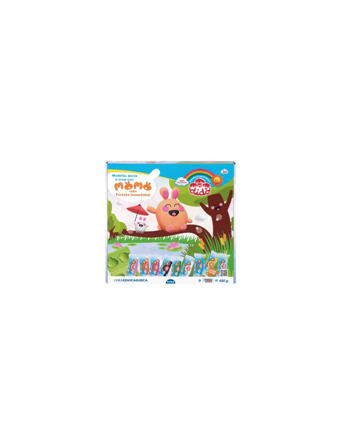 Didò porta i più piccoli in Giappone, nella foresta incantata dove vivono Momo e i suoi amici kawaii. Con 450 g di pasta per giocare Didò e le 2 nuove formine cerniera con cui creare Momo e i personaggi kawaii, disegnati rispettando le regole dell’arte giapponese. L’avventura prende vita sullo scenario kirigami (l’arte di tagliare la carta) pop up, che può essere decorato con gli stickers olografici e animati con gli elementi in cartoncino. Nel mondo di Momo non ci si annoia mai! Contiene: 9 x salsicciotti Didò (= 450g di pasta per giocare); 2 x formine 3D doppie con 4 personaggi Kawaii; 1 x cartoncino con elementi gioco; 1 x scenario Kirigami pop up; 1 x foglietto con stickers olografici; 1 x coltellino; 1 x salvadidò.