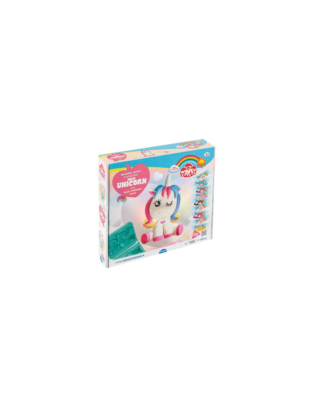 Il soggetto più amato in versione Maxi. Scatola con 450 g di pasta per giocare con la maxi formina unicorno e modellare tanti teneri maxi unicorni con i quali giocare sullo scenario con cartoncini e stickers.