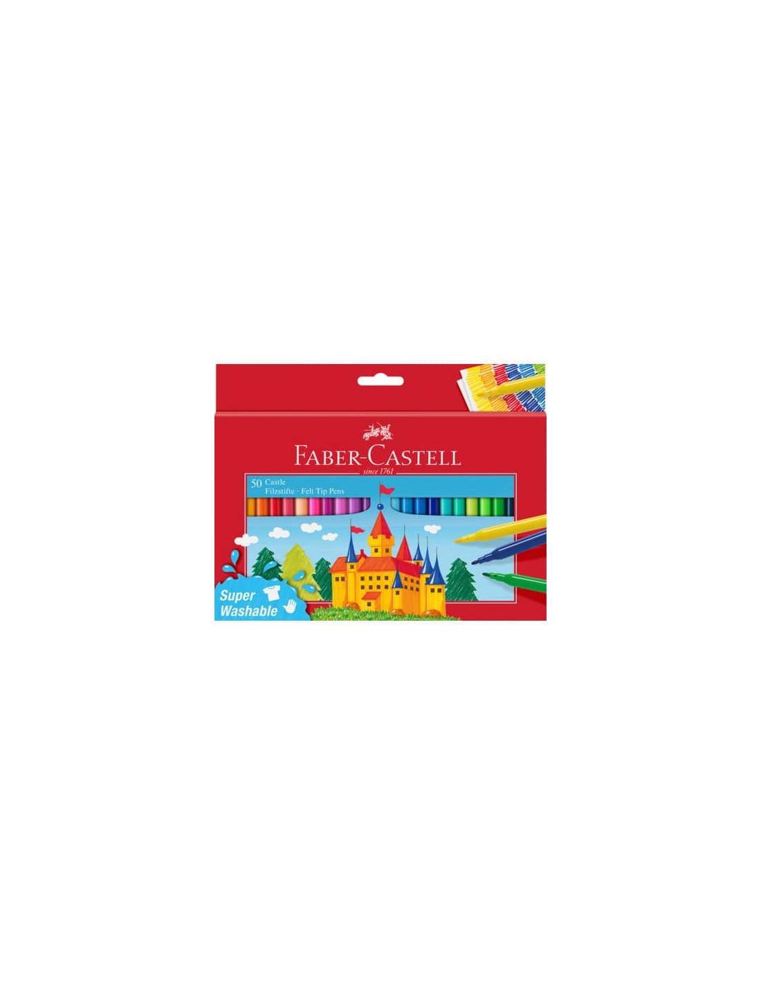 Astuccio in cartone contenente 50 pennarelli Castello a punta Fine. Super lavabili dalla maggior parte dei tessuti. Ideali per dipingere e colorare. Versatili per scuola, ufficio, hobby, arte. Punta fine 3 mm.