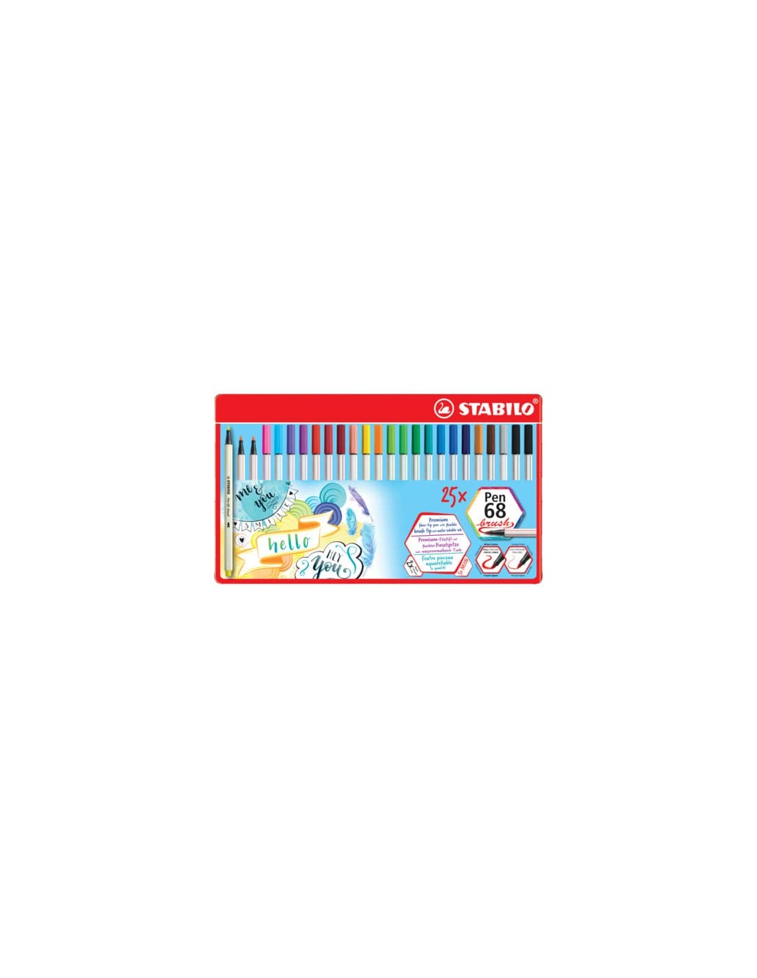 Con il pennarello Stabilo Pen 68 brush puoi controllare perfettamente i tuoi tratti, creando bellissime lettere in vero stile hand lettering. Potrai realizzare bellissime opere in modo semplice e veloce. Con la sua punta flessibile, questo pennarello si aggiunge alla famiglia Pen 68 ed è adatto sia ai principianti che agli artisti esperti. Variando la pressione sulla punta puoi usare il ''pennello'' per creare linee spesse o sottili sulla carta. Puoi creare altri effetti speciali con l'inchiostro a base d'acqua: bellissime sfumature di colore o fantastici acquarelli. Strumento ideale per decorazioni e lavori fai da te. Risultati garantiti e garanzia tedesca. Ideale per chi è alle prime armi con il brush lettering: grazie alla sua punta a pennello molto flessibile, hai subito la percezione della pressione che stai facendo. Usa la giusta pressione per disegnare line più spesse o più sottili – la punta è stata sviluppata proprio per i principianti! Per artisti più esperti, Pen 68 brush copre un ampio spettro creativo: dalle applicazioni artistiche all'ombreggiatura e all'acquarello. Combina le tue sfumature preferite e i risultati saranno unici. L'inchiostro a base d'acqua fornisce un ulteriore tocco creativo: usalo per creare fantastici effetti speciali come la fusione dei colori o gli effetti dell'acquerello Pen 68 brush dura 24 ore senza cappuccio e la punta non secca! Sviluppato da e insieme ai nostri fan - realizzato per soddisfare tutte le esigenze creative. Realizzato in Germania. Prodotto in conformità con il regolamento REACH (CE) n. 1907/2006. Prodotto in conformità con la direttiva sulla sicurezza dei giocattoli 2009/48/EC. Prodotto in conformità con la norma europea EN71 – 1, 2, 3 e 9. Marchio CE. Prodotto in conformità con la direttiva 94/62/EC sugli imballaggi e i rifiuti di imballaggio. Età consigliata: 8 anni in su. Confezione in metallo composta da 25 pezzi, colori assortiti.
