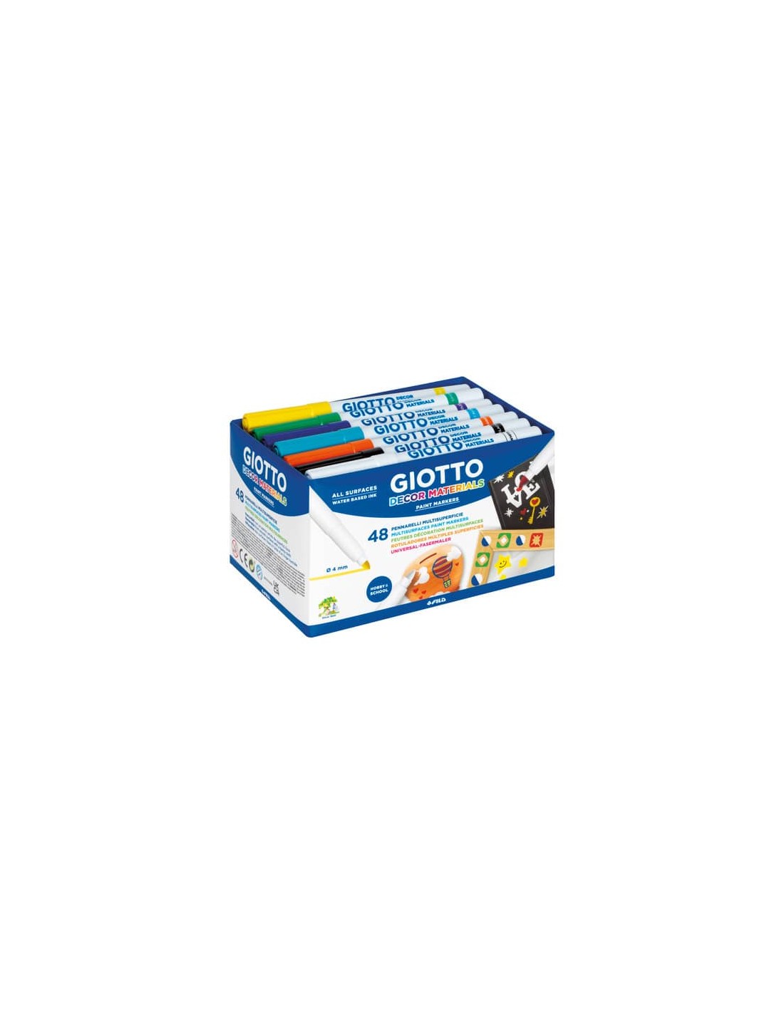 Pennarelli multisuperficie per decorare cartoncino, legno, vetro, cuoio, plastica, sassi, Das, metallo ecc. I colori hanno una resa permanente su materiali porosi e sono removibili con un panno umido da materiali lisci. Per questo motivo sono indicati per decorare temporaneamente vetri e finestre. Tutti gli inchiostri Decor Materials sono base acqua, sicuri e resistenti alla luce. I pennarelli hanno una punta media di diam. 4 mm. Pennino bloccato resistente, tappo di sicurezza e cappuccio ventilato. Tutti i colori sono facilmente lavabili dalle mani ma, per la loro specificità, possono macchiare gli indumenti. In school pack da 48 colori assortiti.