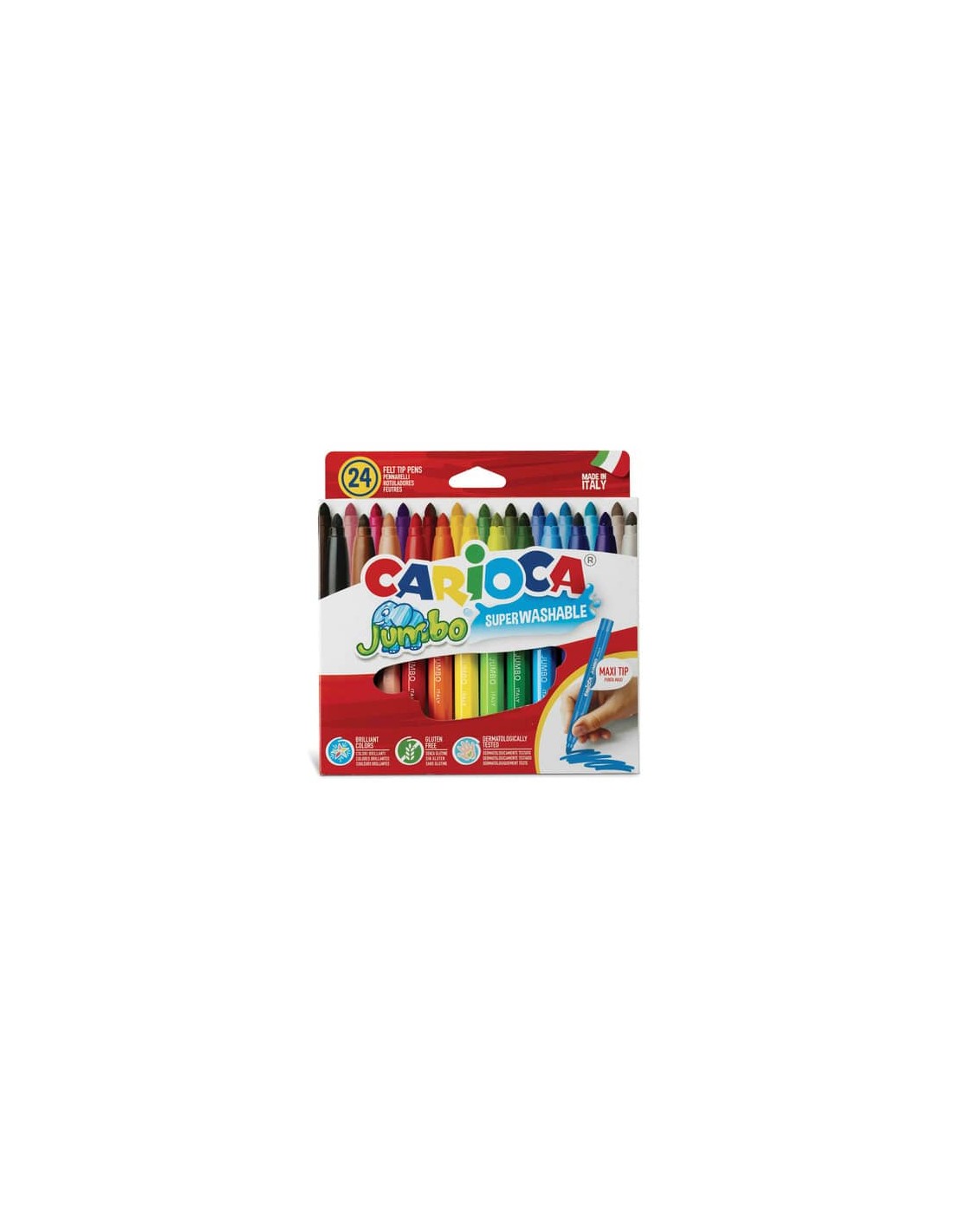 Pennarelli superlavabili Jumbo, corpo maxi ottagonale, punta Maxi e diametro 6 mm. Cappuccio ventilato, dermatologicamente testato, Confezione composta da 24 colori assortiti.