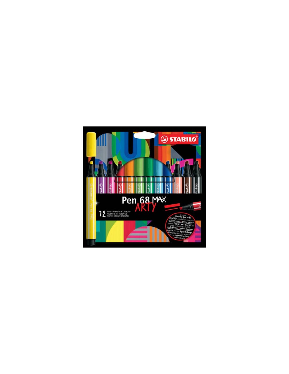 Pennarello Stabilo con punta a scalpello Pen 68 Max. Pensato per tutti quelli che amano esprimere la propria creatività con il colore utilizzando linee decise e colori forti. Punta scalpello doppia ampiezza di tratto : 1 mm e 5 mm. Inchiostro a base d'acqua ideale per effetti acquarello. Non secca fno a 12 ore senza cappuccio. I colori Pen 68 Max si abbinano al 100% con i pennarelli Pen 68 e Pen 68 Brush. Colori: 768/24 giallo limone, 768/26 albicocca, 768/32 blu oltremare, 768/33 verde chiaro, 768/36 verde smeraldo, 768/45 bruno, 768/46 nero, 768/48 carminio, 768/54 arancione, 768/56 rosso scuro, 768/57 azzurro, 768/58 lilla. Astuccio in cartone da 12 pezzi.