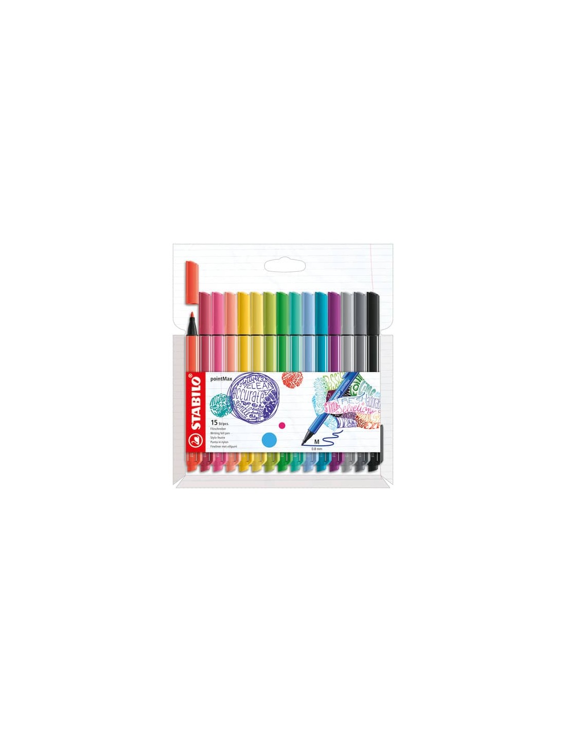 Pennarelli Stabilo PointMax Fineliner Premium con punta nylon ''L'' da 0.8 mm. Resiste fino a 24 ore senza cappuccio. Inchiostro inodore a base d'acqua. Dotato di comoda clip. Astuccio appendibile con 15 colori: 488/5 - giallo chiaro, 488/7 - corallo, 488/11 - blu ghiaccio, 488/13 - verde ghiaccio, 488/14 - lime, 488/26 - albicocca, 488/29 -rosa chiaro, 488/31 - azzurro chiaro, 488/43 - verde foglia, 488/44 - giallo, 488/46 - nero, 488/49 - rosso fragola, 488/58 - lilla, 488/94 - grigio freddo chiaro, 488/96 - grigio scuro.