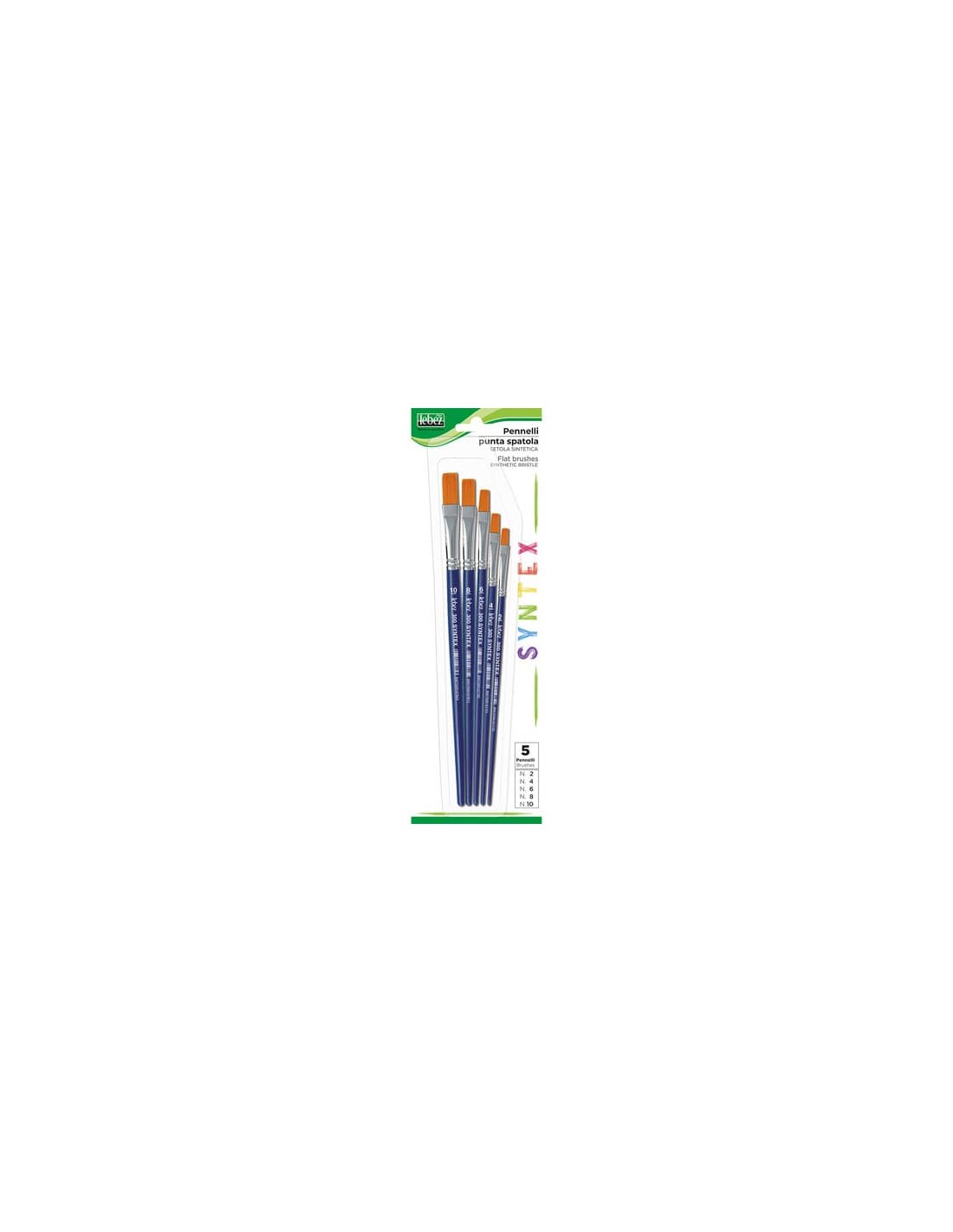 Blister da 5 pennelli Lebez Syntex con manico in legno verniciato. Punte piatte in setole sintetiche. Contenuto: 1 pennello per misura 2-4-6-8-10.