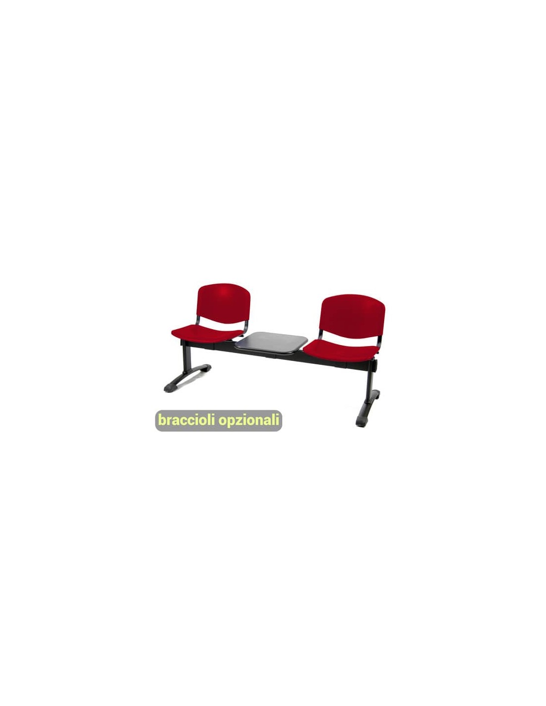 Panca a 2 posti collettività-attesa con tavolino Dado D5P2PT, struttura in acciaio nero, Braccioli opzionali (codici 110073, 110078), a schienale fisso. Sedute realizzate in PPL rosso. Dado è una linea veramente multipurpose, che presenta ogni soluzione per i più svariati utilizzi