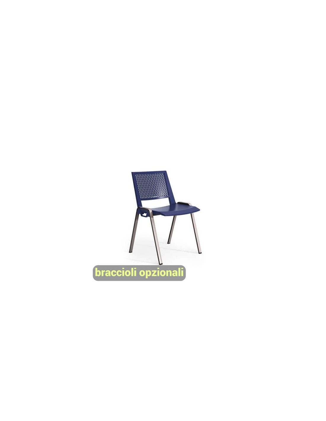 Sedia visitatore a 4 gambe Kentra KEC, struttura in acciaio cromo, impilabile con aggancio rapido a scomparsa, schienale a forma di rete traspirante. Schienale e seduta in polipropilene di colore blu. Braccioli opzionali. Una serie di robuste ed eleganti sedute per ogni soluzione d’arredamento, testate fino a 150 kg.