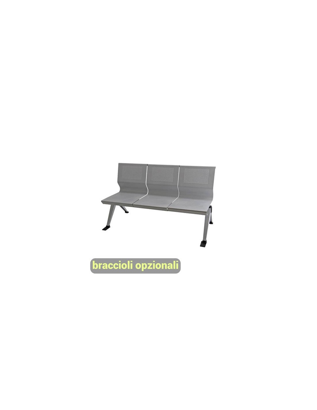 Panca a 3 posti collettività-attesa Panair PA3P, struttura in acciaio verniciato grigio, con finitura alluminio, a 4 gambe, schienale fisso, braccioli opzionali. Seduta e schienale forati traspiranti, l’ideale per ambienti d’attesa.