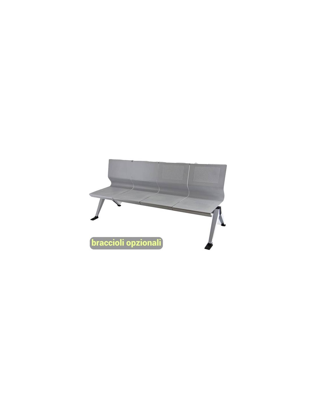 Panca a 4 posti collettività-attesa Panair PA4P, struttura in acciaio verniciato grigio, con finitura alluminio, a 4 gambe, schienale fisso, braccioli opzionali. Seduta e schienale forati traspiranti, l’ideale per ambienti d’attesa.