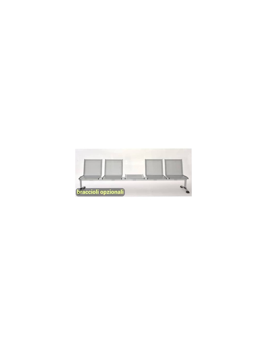 Panca a 4 posti collettività-attesa Plexus PA4PT con tavolino porta riviste, struttura in acciaio verniciato grigio, con finitura alluminio, a 2 gambe, schienale fisso, braccioli opzionali. Seduta e schienale forati traspiranti, l’ideale per ambienti d’attesa.
