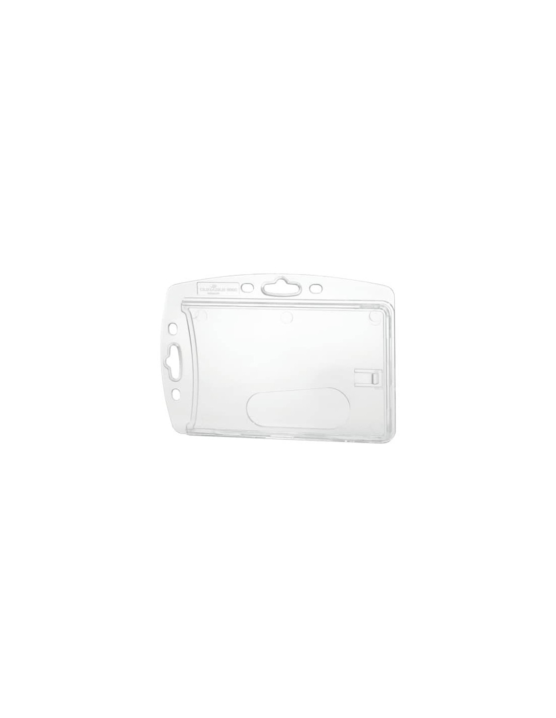 Portabadge rigido in acrilico trasparente crystal-clear. Dotato di un fermo interno per mantenere in posizione il badge una volta inserito e di asola sulla parte frontale che ne facilita la rimozione. Utilizzabile sia in posizione verticale sia orizzontale, può essere agganciato a clip, cordoncini, catenelle e chiocciole yo-yo.