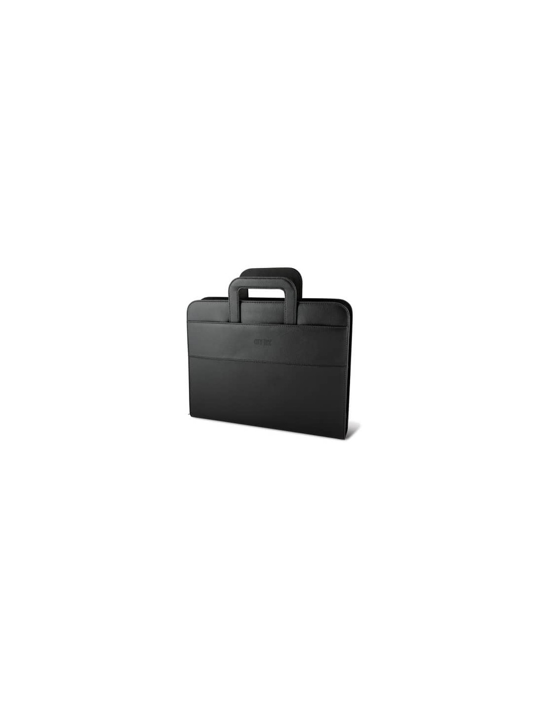 Portablocco ''Professional'' in similpelle morbido colorato. Interno in tessuto a righe. Con cerniera e varie tasche interne. Manici rientranti. 4 anelli metallici diametro cm 3,5. Completo di blocco. Formato 36x28,5x6 cm, colore nero.