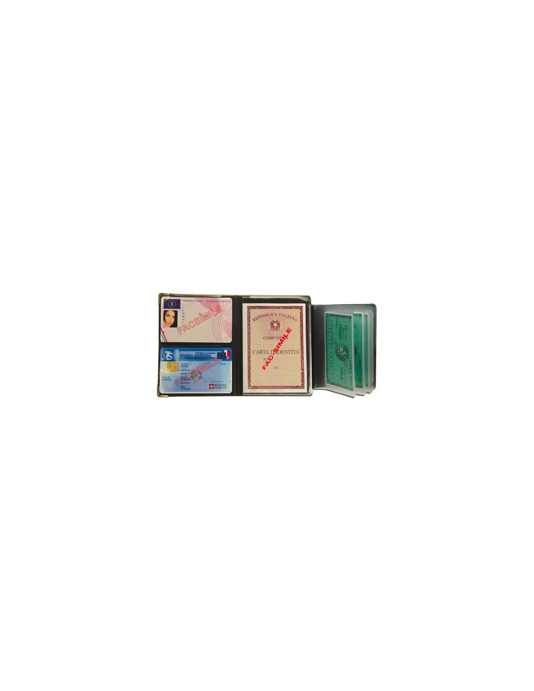 Portadocumenti multiplo Multicard Special. Copertina in PVC espanso sergè e similpelle. Angoli in metallo con finitura in nichel. Tre scomparti più un interno a libretto per altre 5 card.