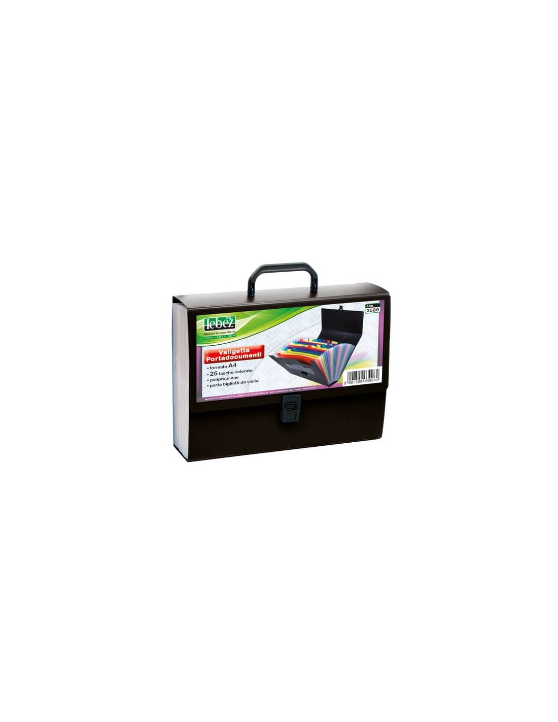 Portadocumenti 25 scomparti in robusto polipropilene, con portabiglietti da visita, f.to 33x24,5x8 cm. Colori assortiti blu, nero, rosso.