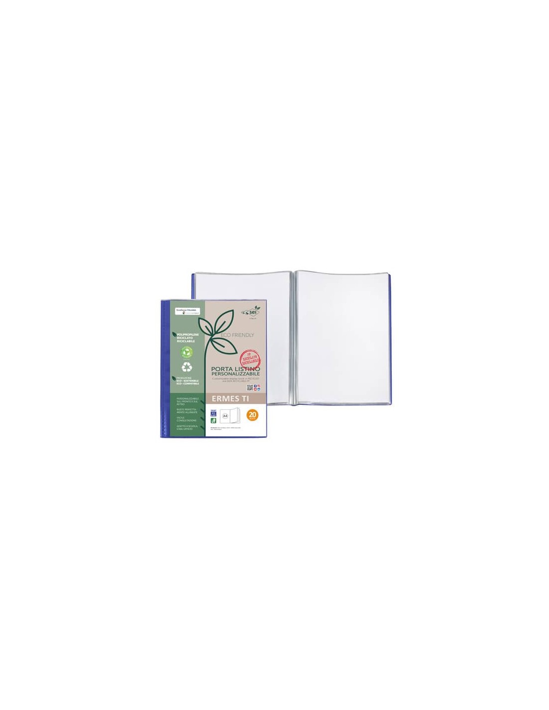 Portalistini in PP buccia, riciclato e riciclabile, colorato con copertina e retro personalizzabili. Il perfetto allineamento delle buste permette di consultarlo agevolmente. Formato 22x30 cm. Colore blu. Composto da 20 buste.