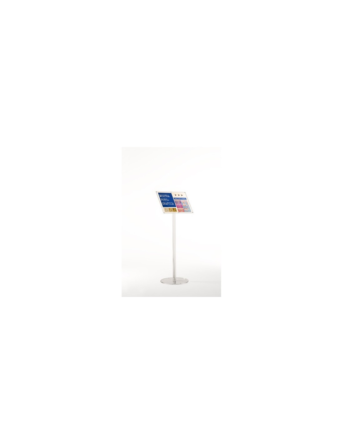 Porta comunicazioni Menu Board in acrilico su piantana, con pannello a chiusura magnetica disponibile. Formato: A4. La rotazione del pannello porta avvisi consente il posizionamento del messaggio sia in orizzontale sia in verticale. La chiusura magnetica protegge il foglio inserito, grazie ai pannelli in materiale acrilico.