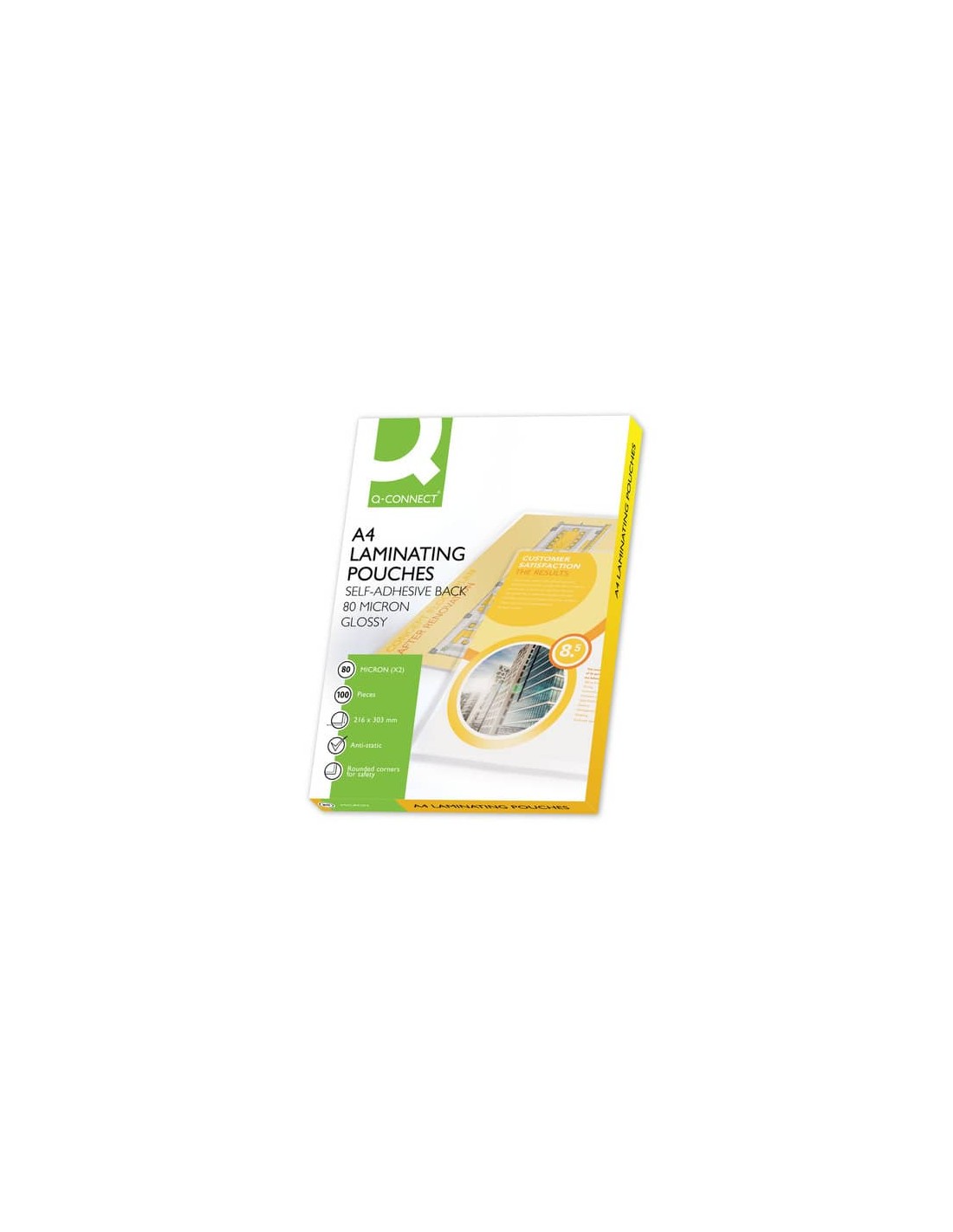 Pouches per plastificatrici con retro autoadesivo. Spessore 80 µm per lato. Finitura lucida. Formato A4 (216x303mm). In confezione da 100 pezzi. Dimensione confezione L. 30,6 x P. 21,9 x H. 3 cm.