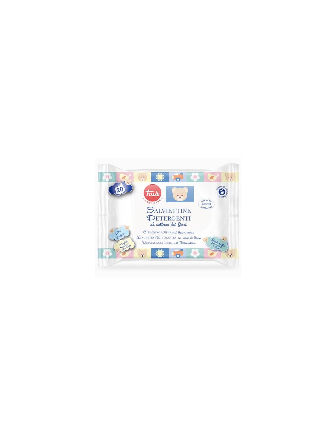 Le salviettine detergenti umidificate al nettare dei fiori Trudi Baby Care sono indispensabili vicino al fasciatoio e nella borsa da viaggio. Grazie al loro particolare tessuto in microspugna a nido d'ape, accarezzano morbidamente il sederino del bebè ad ogni cambio pannolino, lasciando sulla pelle uno strato di leggera emulsione fluida a base di nettare dei fiori. Ideali anche per le manine e il visino del bebè. Dermatologicamente testate. Conservare in luogo fresco ed asciutto e lontano da fonti di calore. La confezione deve essere consumata entro 6 mesi dall'apertura (PAO 6 mesi). Non utilizzare su cute lesa.Tenere lontano dalla portata dei bambini. Dimensioni salvietta: 180 x 200 mm. Composizione salvietta: 40%CV-60%PES. Tessuto salvietta: Big dot. Grammatura salvietta: 50 g/mq. Confezione da 20 salviettine.