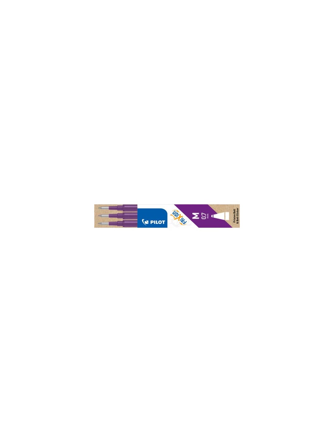 Set da 3 refill adatto per penne a sfera Frixion Ball e Frixion Clicker 0,7 mm. Refill che permette di cancellare l’inchiostro tramite la frizione della sfera in plastica alloggiata nell’estremità del fusto. Tratto 0,35 mm. Colore viola.