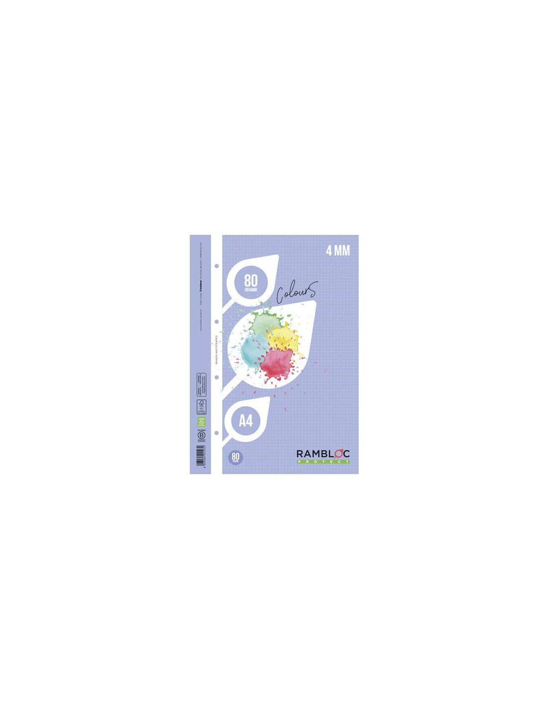 Blocco fogli di ricambio per copertine ad anelli, lato lungo rinforzato. Blocco da 40 fogli a quadretti 4 mm, carta 80 gr. Certificazione FSC. Colore azzurro.