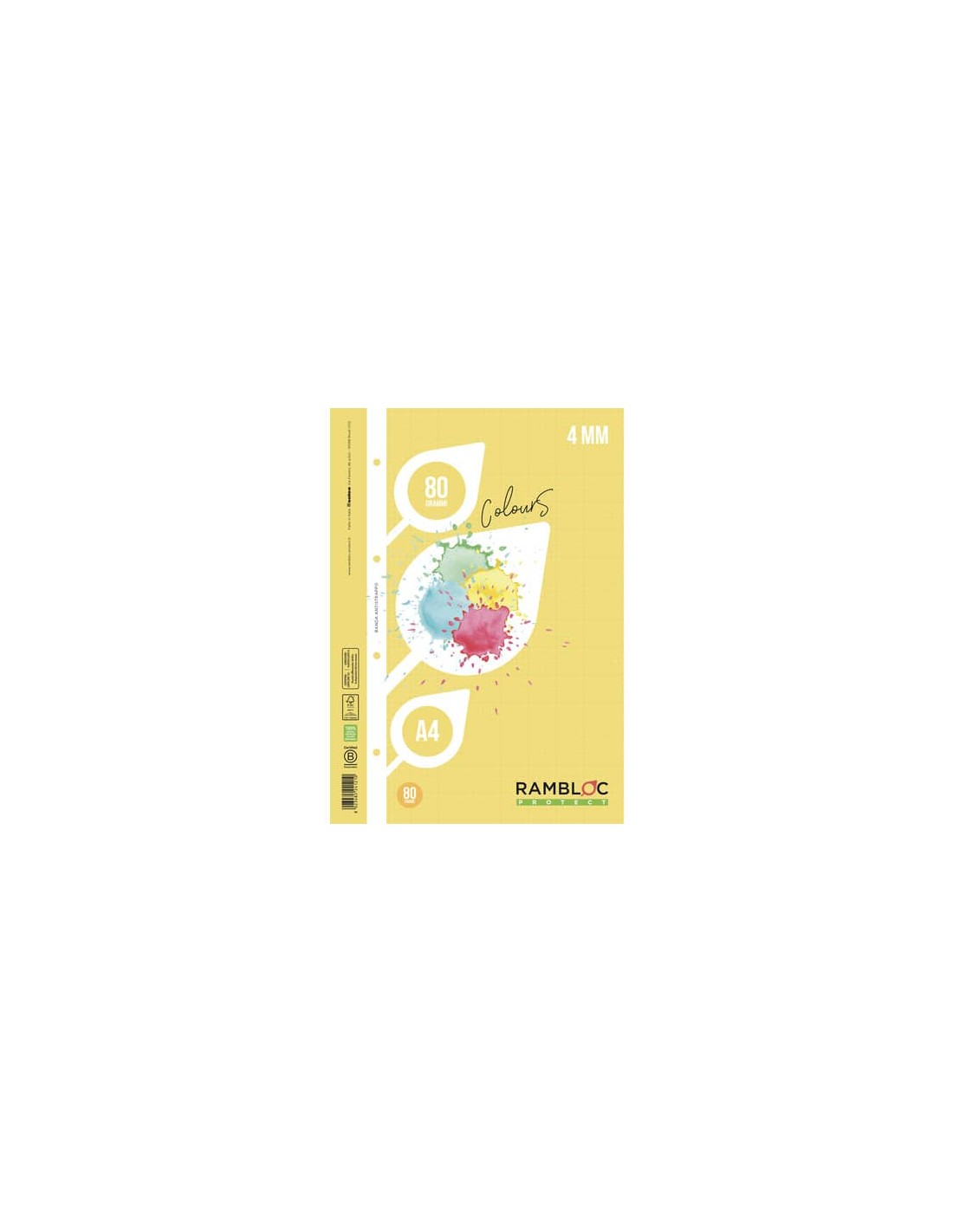 Blocco fogli di ricambio per copertine ad anelli, lato lungo rinforzato. Blocco da 40 fogli a quadretti 4 mm, carta 80 gr. Certificazione FSC. Colore giallo.