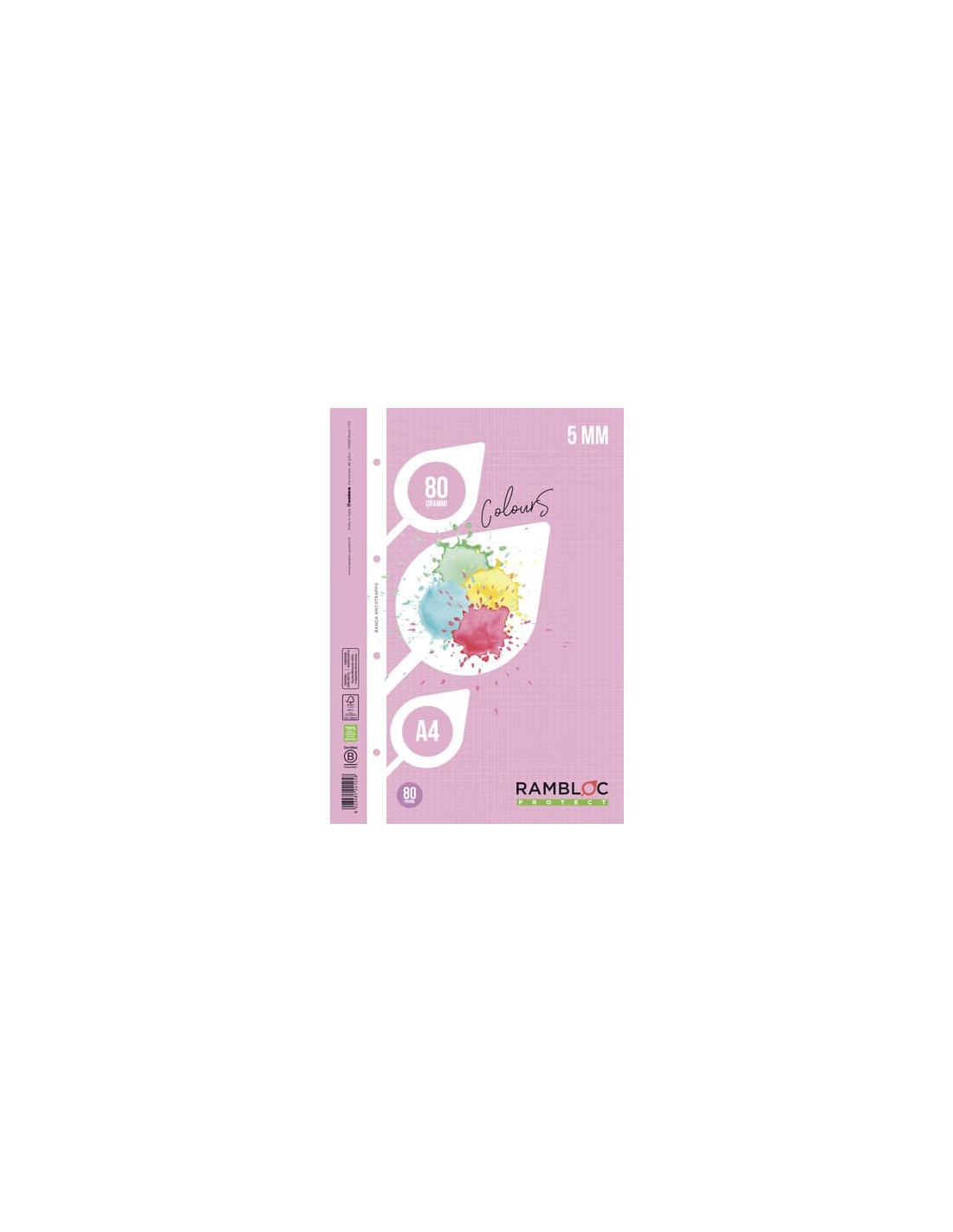 Blocco fogli di ricambio per copertine ad anelli, lato lungo rinforzato. Blocco da 40 fogli a quadretti 5 mm, carta 80 gr. Certificazione FSC. Colore rosa.